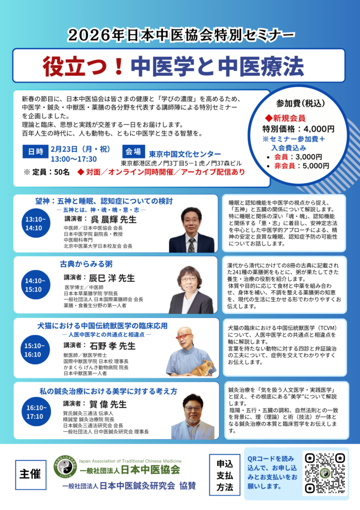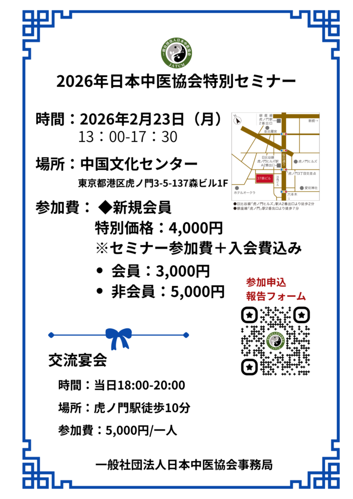 **「2026年 日本中医協会 特別セミナー」**を開催いたします。